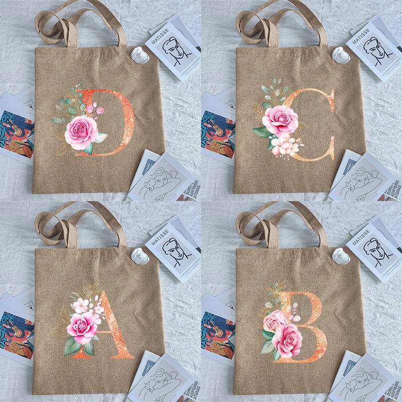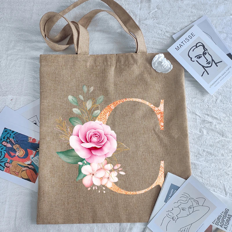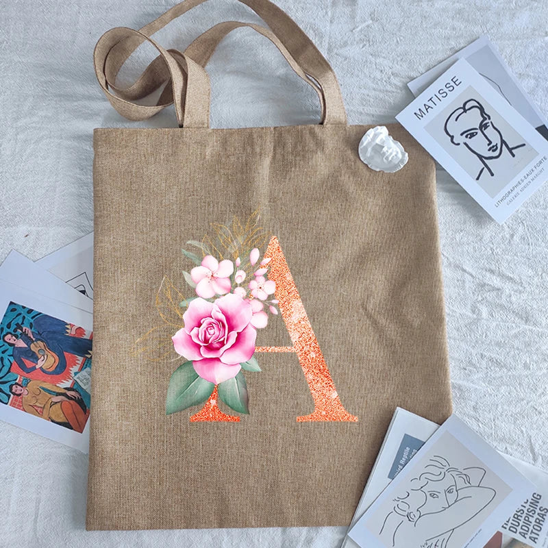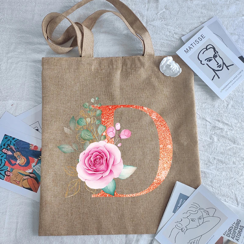 Stay stylish while shopping with this reusable linen canvas bag featuring an orange letter print. Perfect for students and eco-conscious shoppers.