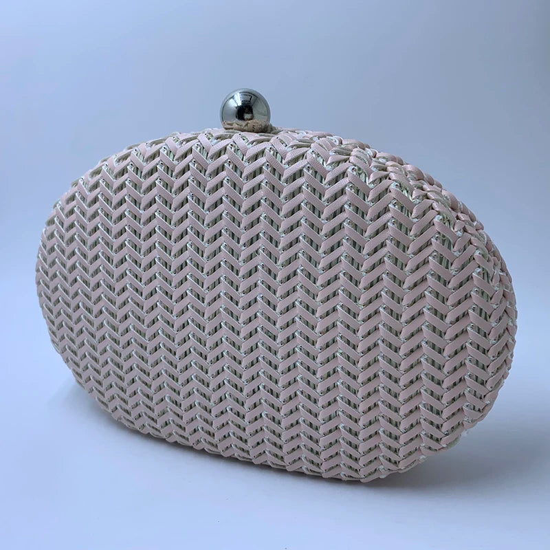 Elegant oval shape clutch and evening bag in pink drop color. Perfect for parties and special occasions.