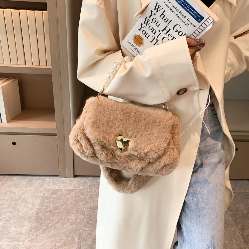Embrace elegance and style with this faux fur small shoulder bag. Featuring pearls chains and a fluffy design, this handbag is perfect for fashion-forward women.