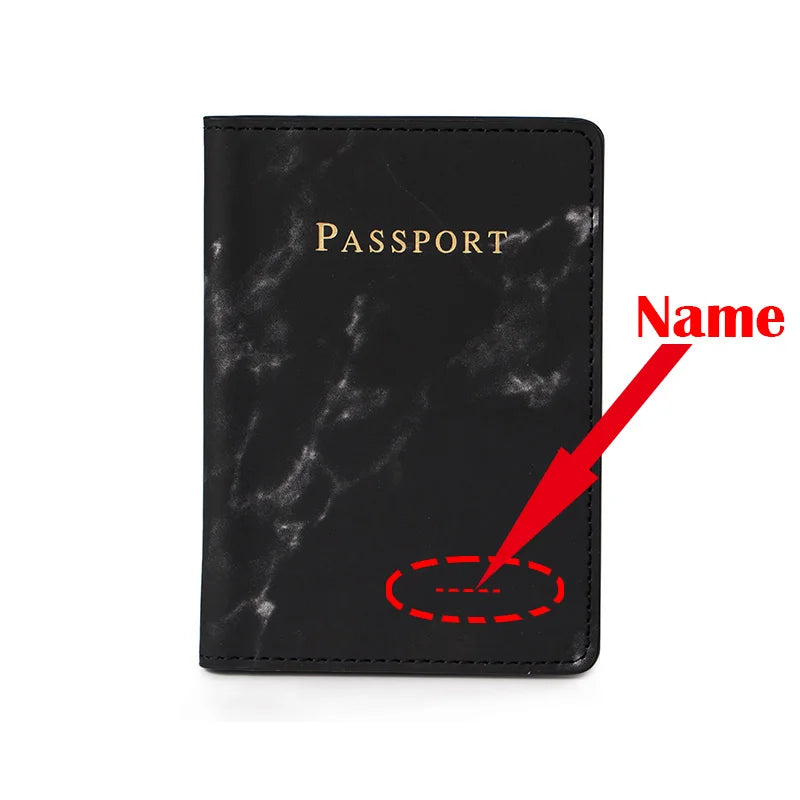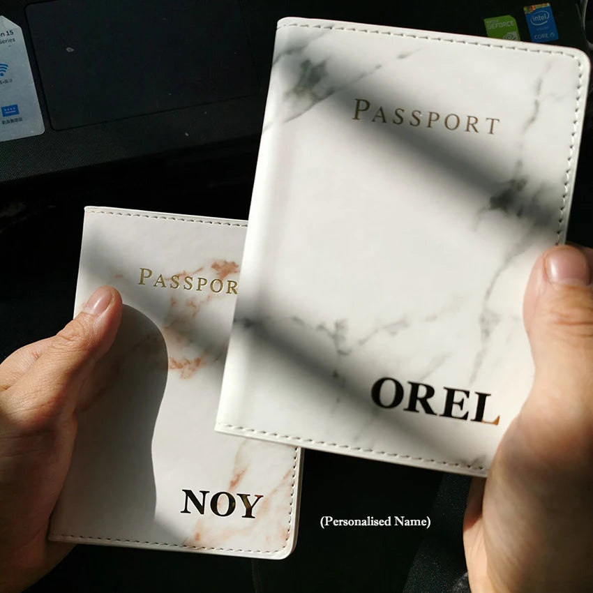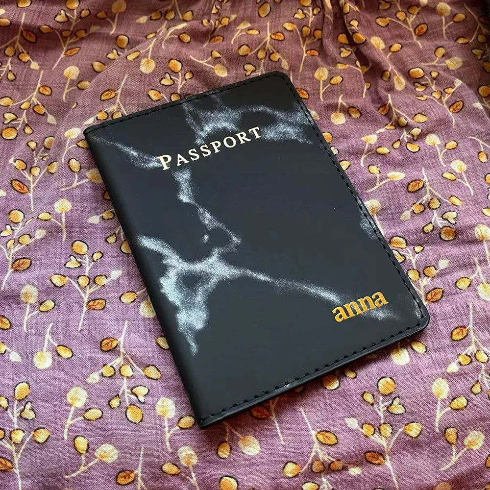 Elegantly designed passport cover with marble pattern for women, personalized with your name. Keep your passport safe and stylish while traveling.