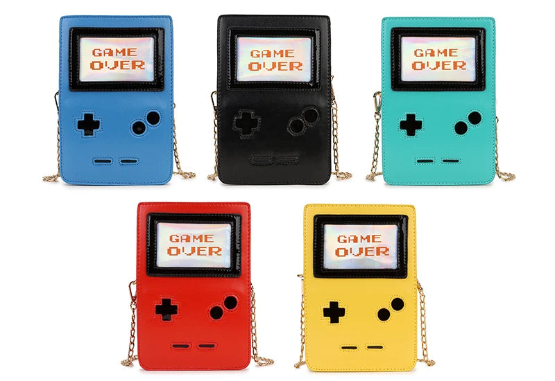 Get this stylish Pink Game Machine GAME OVER purse for women. It is made of high-quality leather and features a shoulder strap, flap closure, and a crossbody design.