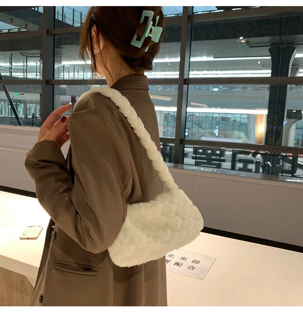 Stay cozy and stylish with this soft faux fur shoulder bag. Perfect for winter outings, this plush bag features a cute pink heart design. Ideal for any fashion-forward woman.