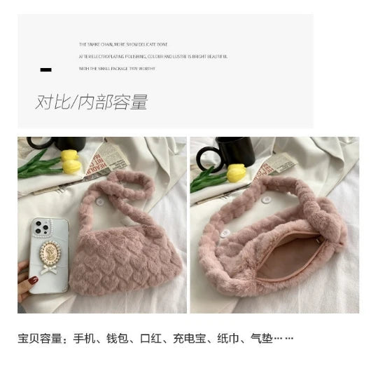 Pink Heart Lady Faux Fur Shoulder Bag Winter Warm Furry Plush Crossbody Purse