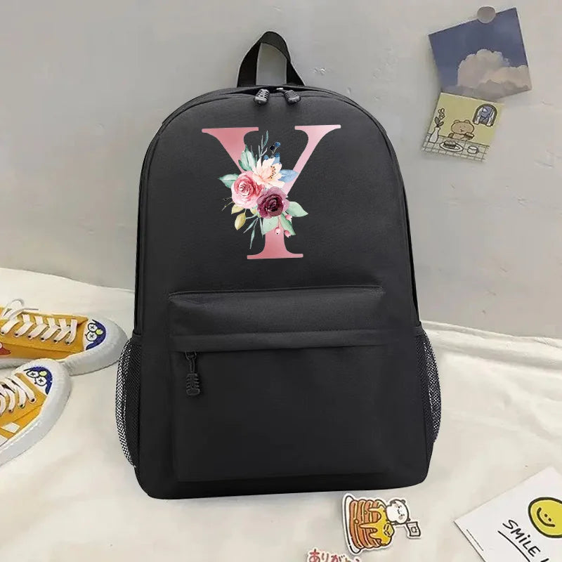 This stylish pink backpack is perfect for travel and everyday use. It features a letter print design and is ideal for teenage girls and students.