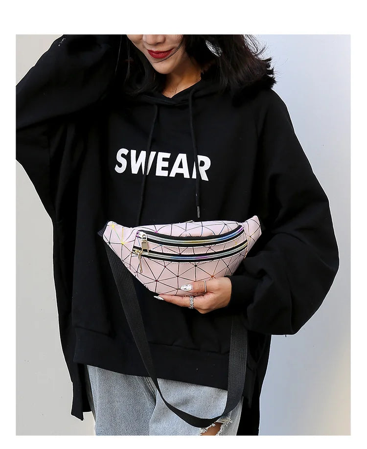Stay trendy with this pink and silver geometric waist pack that can be worn as a fanny pack or chest phone pouch.
