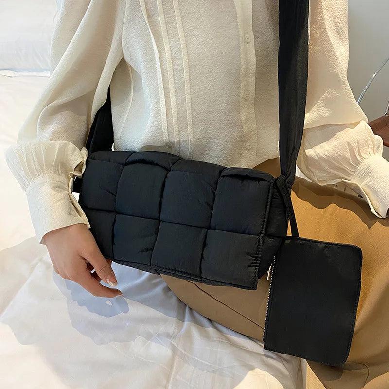 Stay cozy and stylish with this plaid down shoulder bag made of cotton woven material. This crossbody bag is perfect for women looking for a warm and soft handbag to carry their essentials in style.