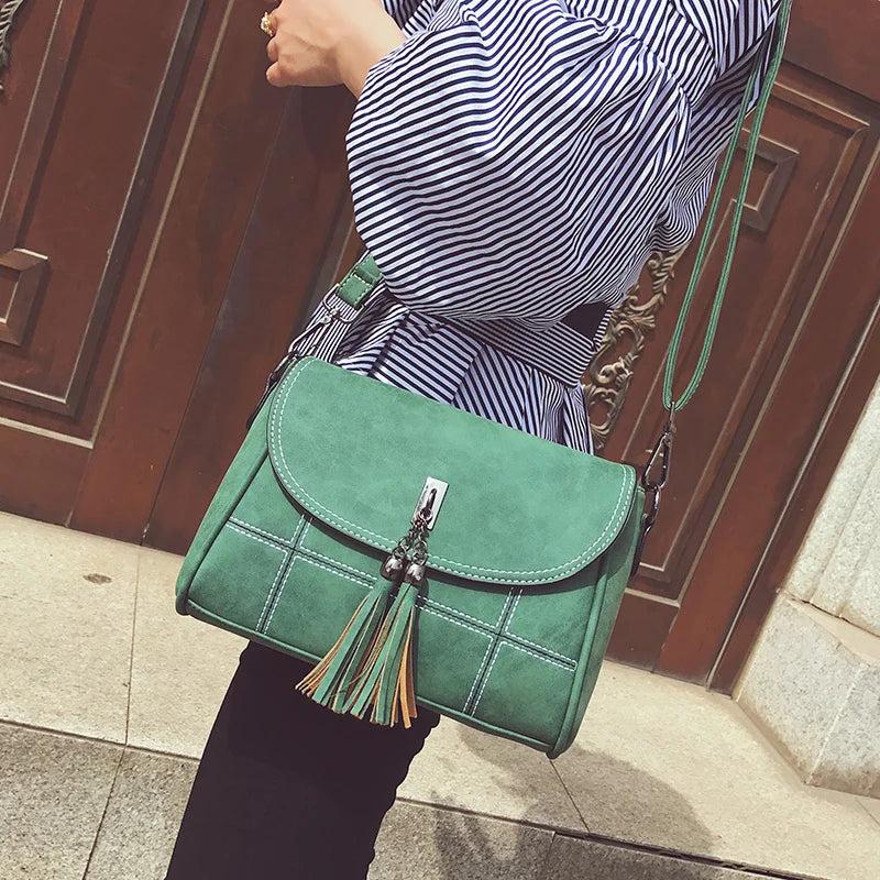 Stay stylish on the go with this plaid messenger handbag featuring tassels and a crossbody design. Made of durable leather, it's perfect for daily use or travel.
