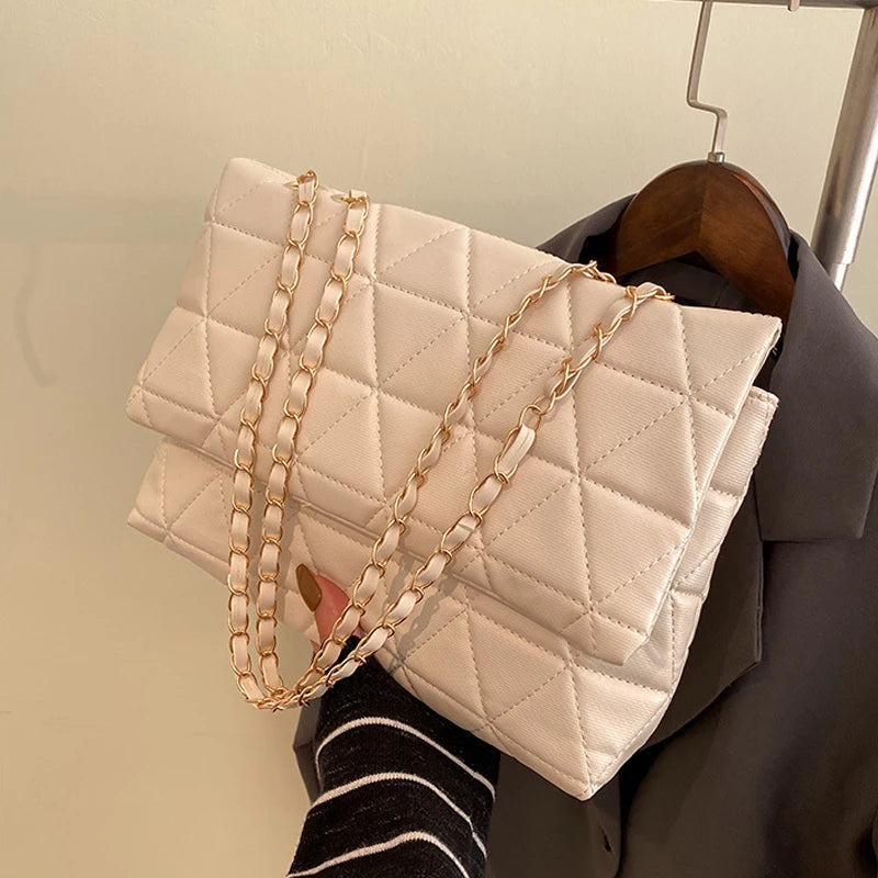 Elegant plaid patterned shoulder bag with chain strap, perfect for women. Made of high-quality PU leather, this crossbody bag is a stylish addition to your collection.