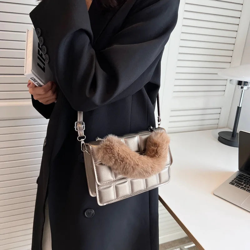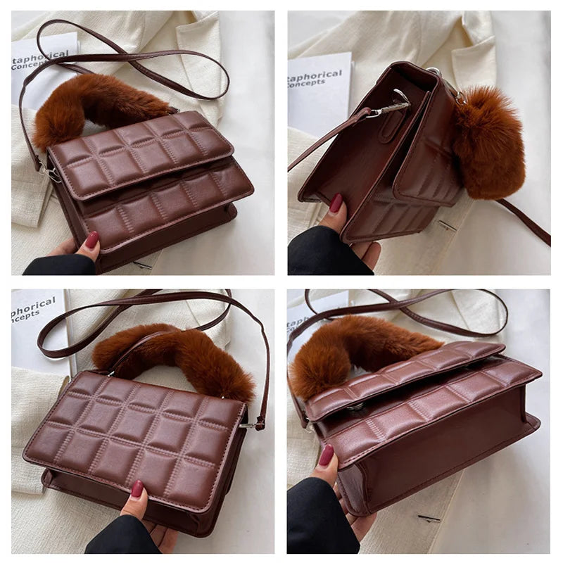 Stay stylish and cozy with this plaid women shoulder bag featuring a winter hairy handle. Ideal for carrying essentials during the chilly season.