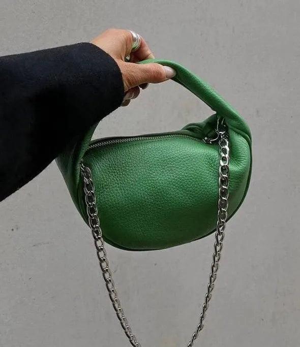 This shoulder bag features a pleated design made of soft PU leather. It has a thick chain strap and a dumpling shape clutch style, creating a solid cloud messenger handbag.