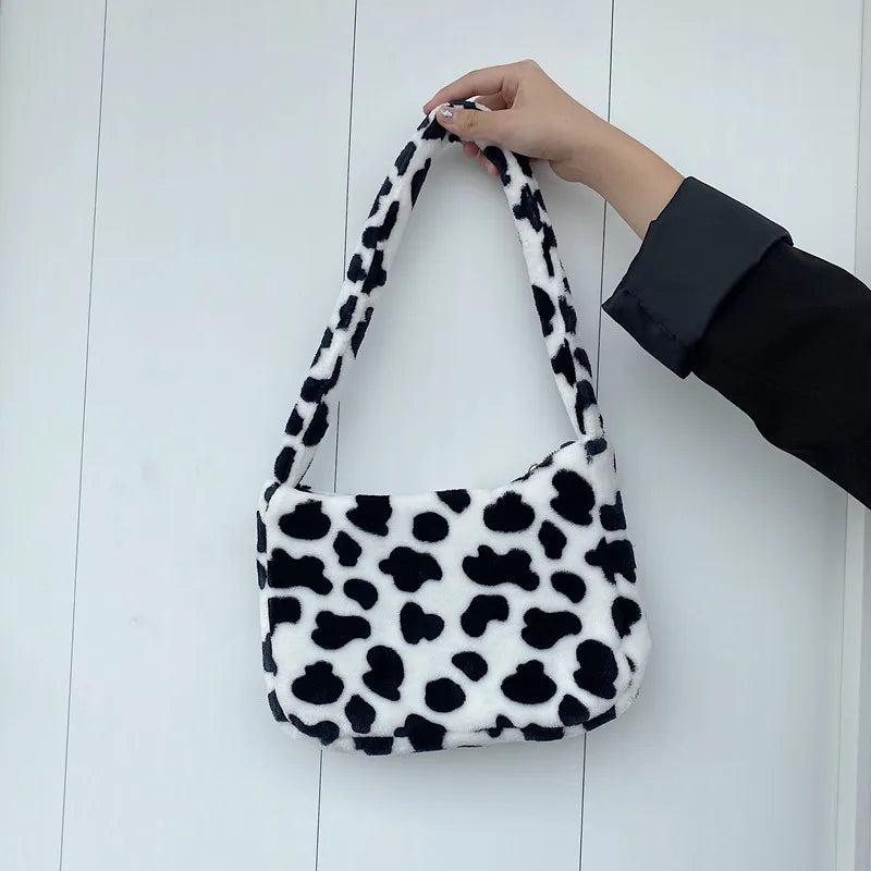 This plush cow underarm bag is a casual and practical accessory for women. It features a large capacity and contrast design, making it a stylish choice for everyday use.