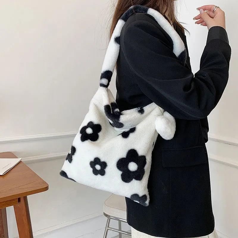 Stay trendy with this plush flower shoulder bag that is perfect for women. It is soft, warm, and ideal for students. Embrace the Korean, Japanese Y2K style with this lovely shopping bag.