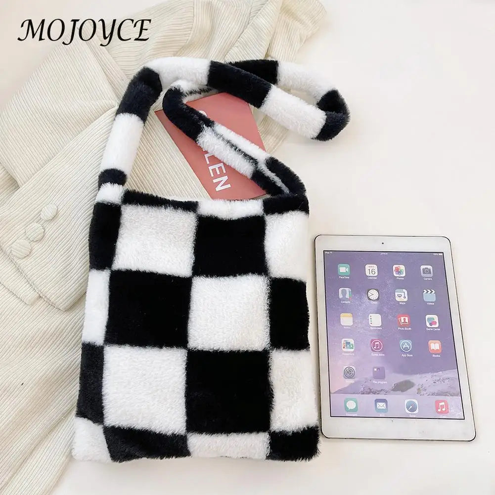 Stay stylish and warm with this winter shoulder bag featuring a trendy lattice print and plush material. Perfect for adding a fashionable touch to your winter outfits.