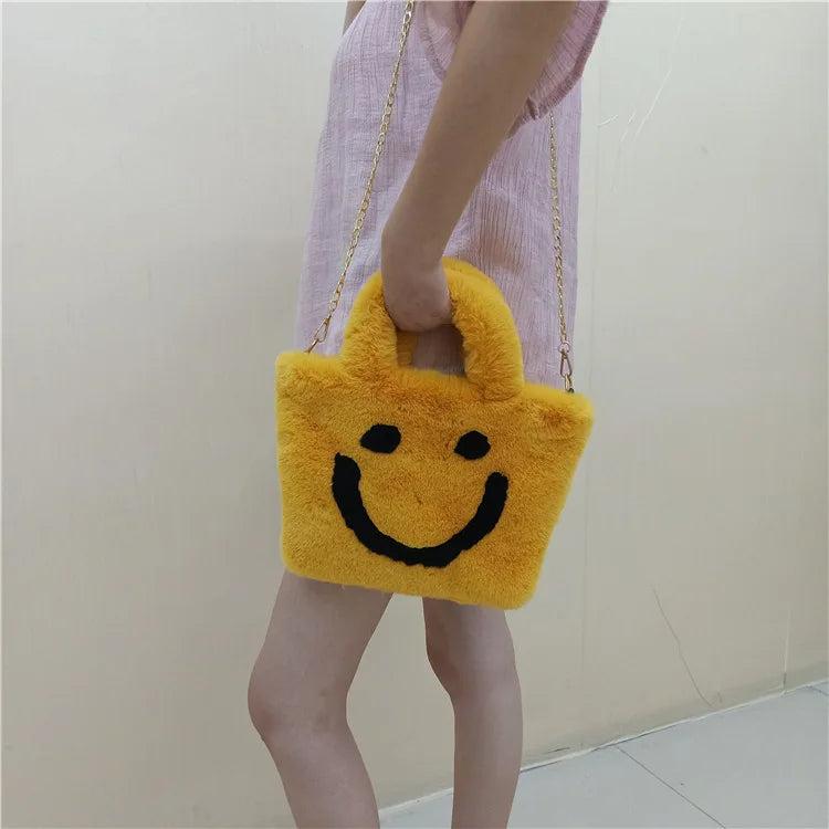 Plush Smiley Face Women Shoulder Bag Soft Faux Fur Chain Messenger Purse