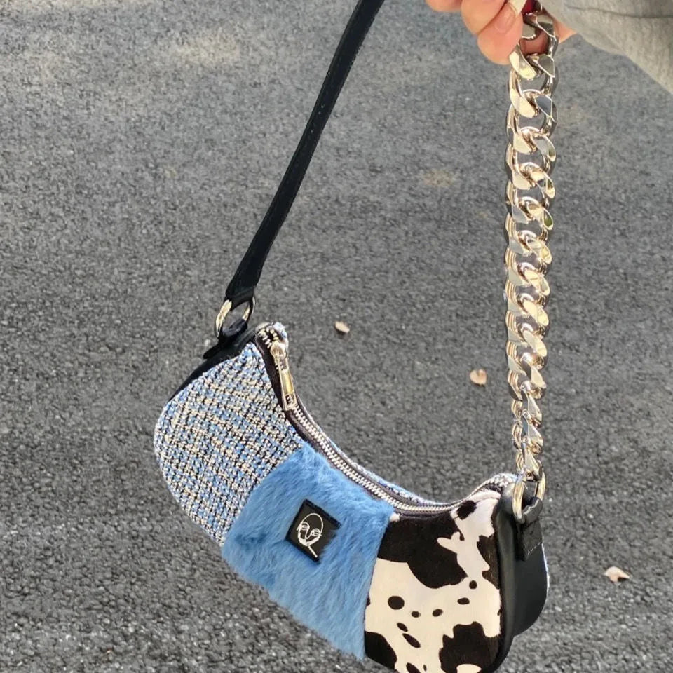Elegant and stylish messenger bag with plush splicing design for a trendy look. Features a metal chain tote design, perfect for carrying your essentials. Ideal for daily use and special occasions.