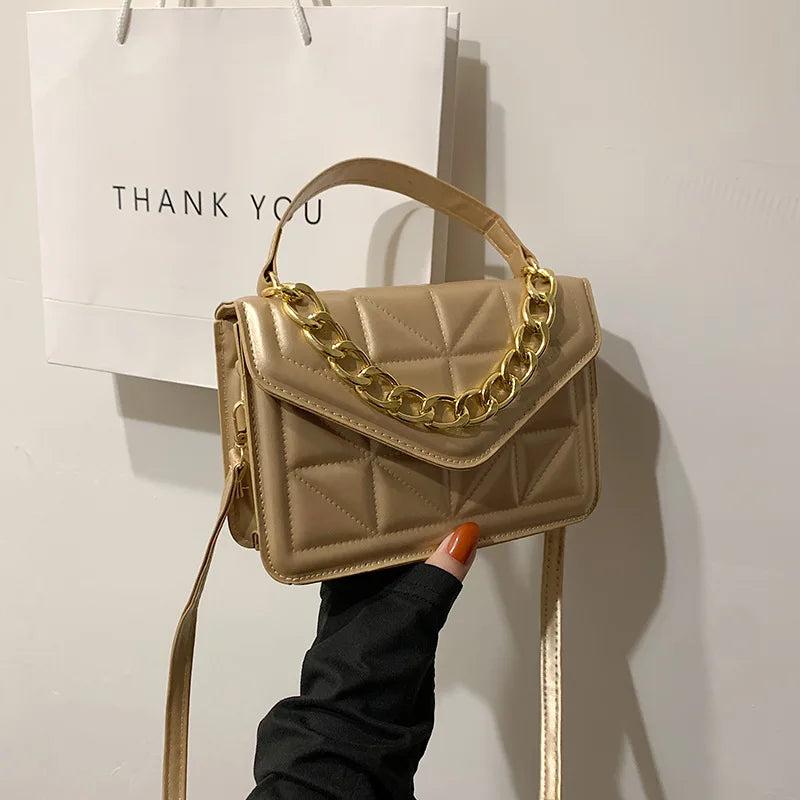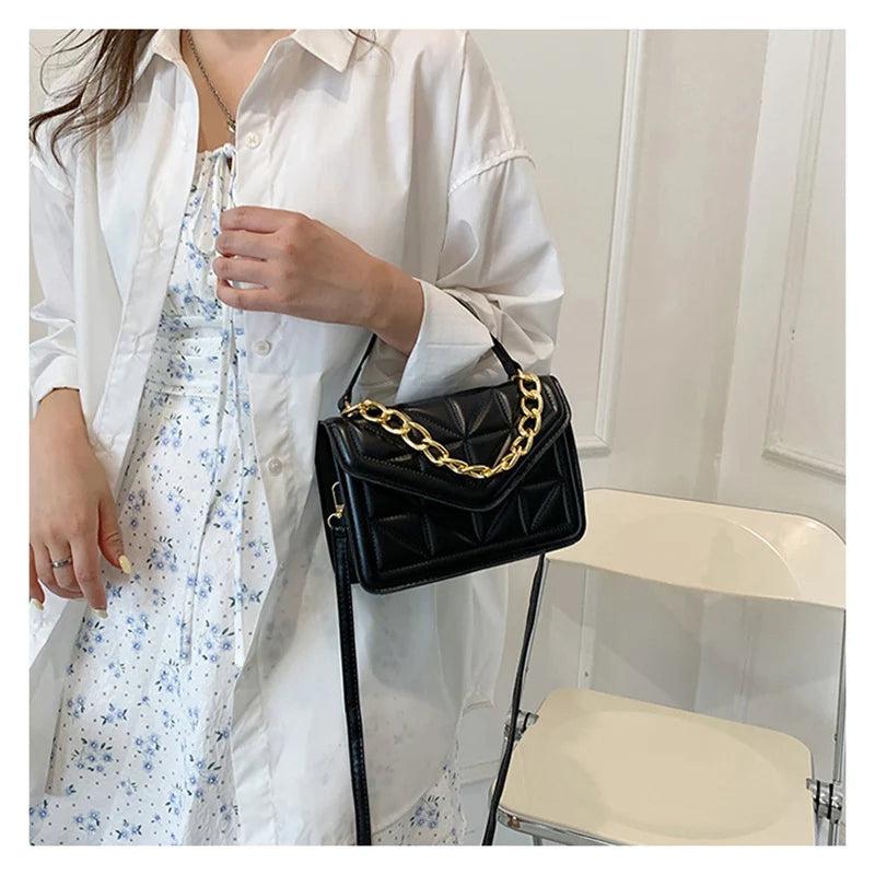 This stylish shoulder bag features a flap design with small chains decoration, perfect for casual outings. Made of high-quality PU leather, this handbag is both fashionable and practical.