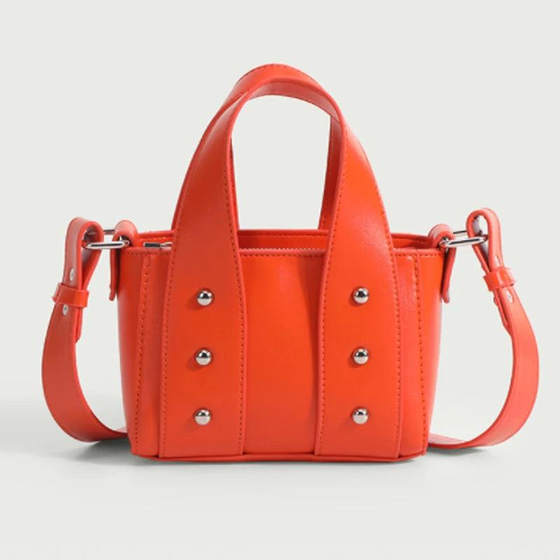 This stylish PU leather handbag is perfect for women looking for a compact yet fashionable accessory. It features rivet detailing and can be worn as a shoulder or messenger bag.