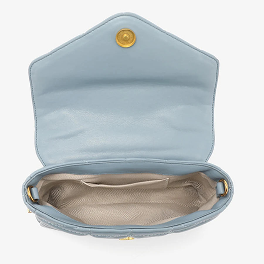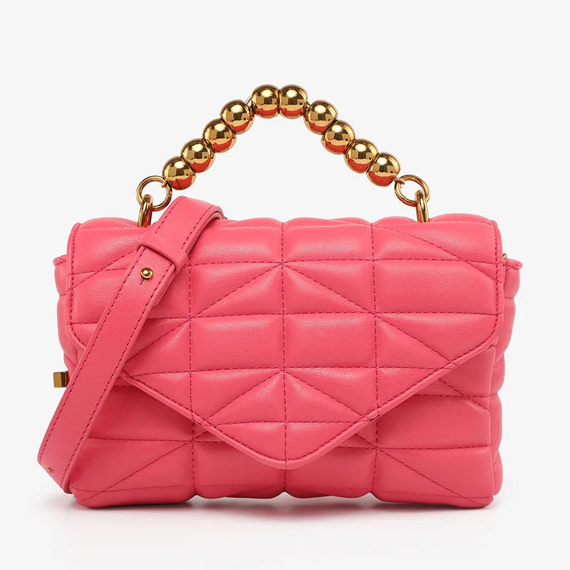 This stylish handbag features a unique quilted padded design with beading detail on the handle. It can be worn as a shoulder bag or crossbody bag, making it a versatile accessory for any outfit.
