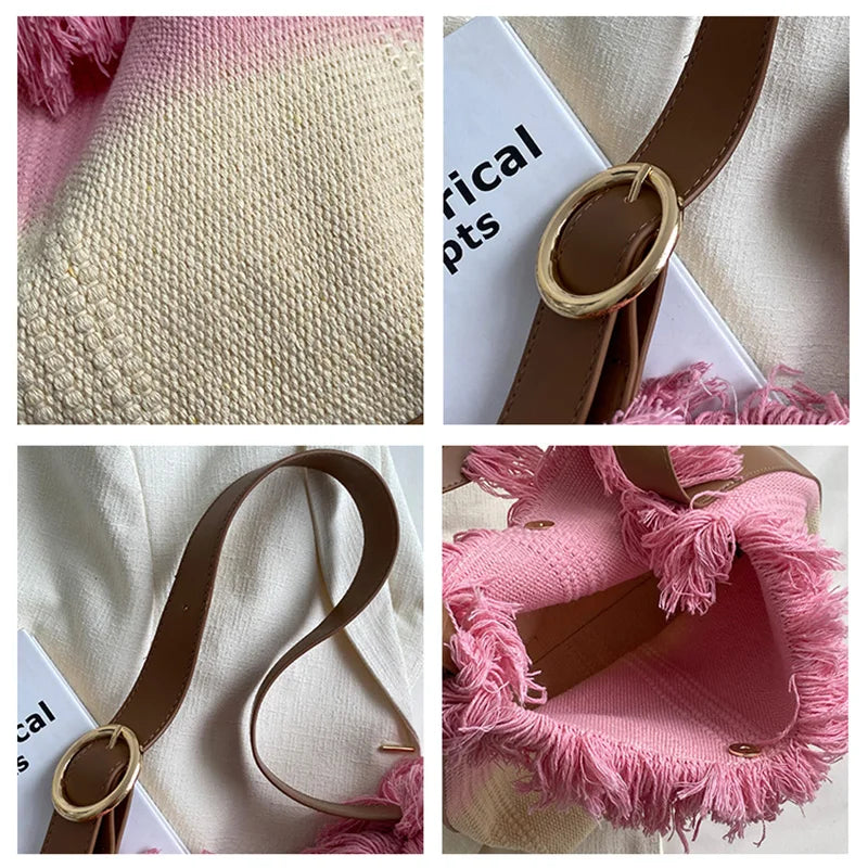 This women's bag is made of high-quality PU and canvas materials, offering a fashionable and spacious design. It features a shoulder strap for crossbody wear and a large capacity for all your essentials.