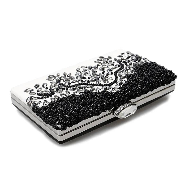 This elegant evening clutch features intricate embroidery and sparkling diamonds, perfect for weddings, nightclubs, and dinner parties.
