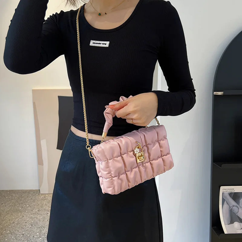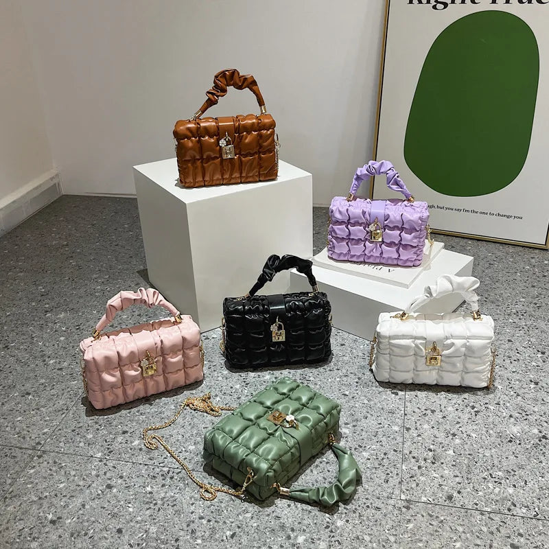 Puff Leather Lock Crossbody Bag Ruched Handle Shoulder Bag