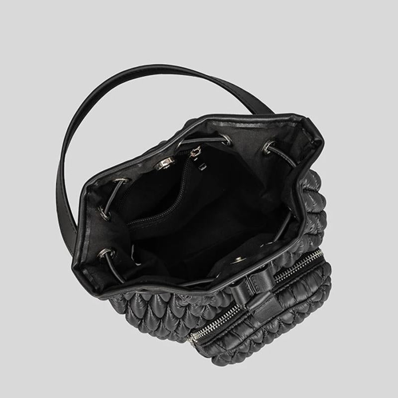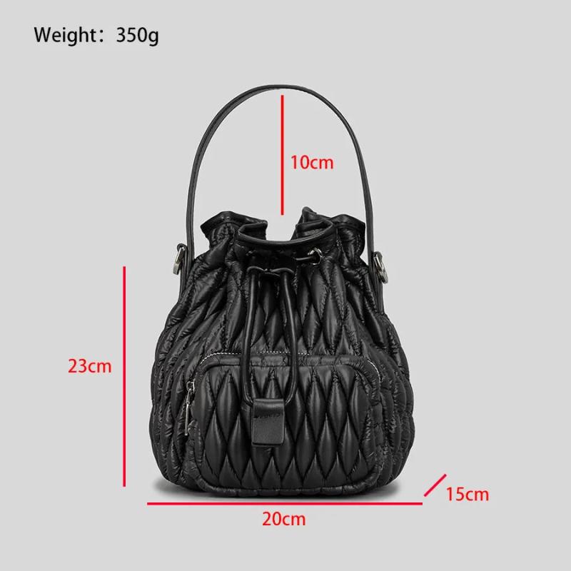 Stay on-trend with this stylish padded bucket bag featuring ruched design, lattice drawstring closure, and down cotton handle. Perfect for everyday use!