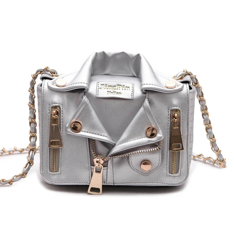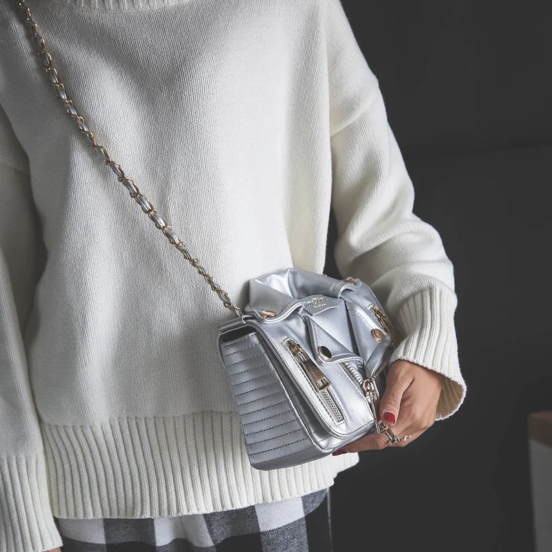 This silver messenger bag features a jacket shape design perfect for punk style. It is a mini-sized crossbody bag that is ideal for women who love edgy fashion.