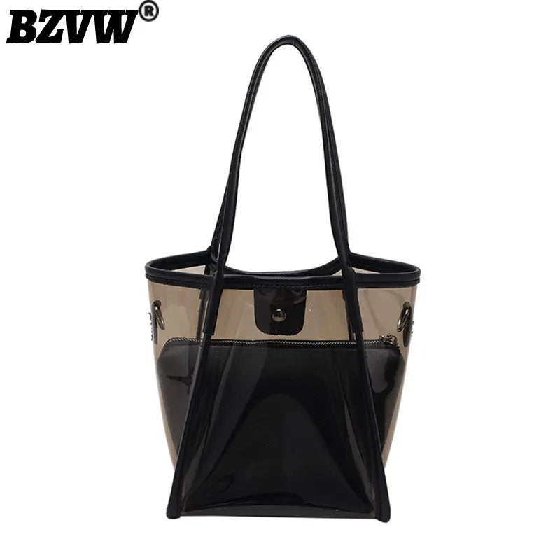 This PVC transparent tote bag features a large capacity and solid construction, perfect for casual use. It can be carried as a shoulder bag or handbag.