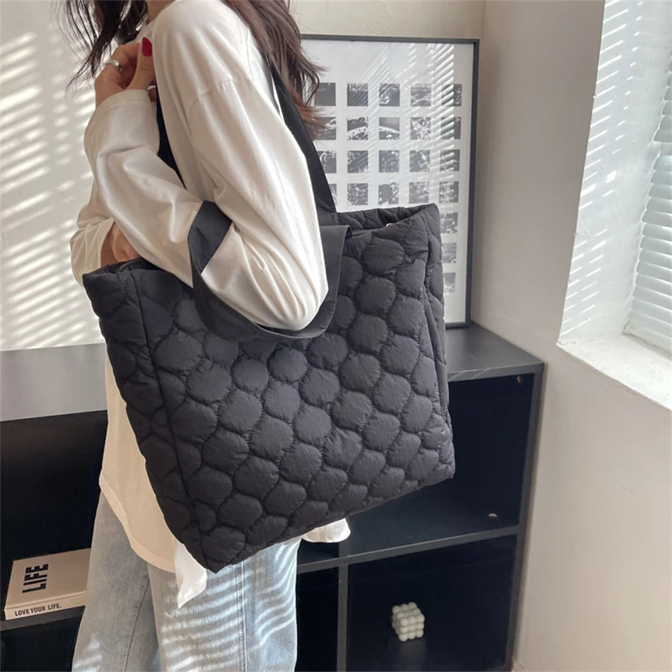 Quilted Nylon Shopper Handbag for Women, Big Shoulder Bag with Soft Cotton