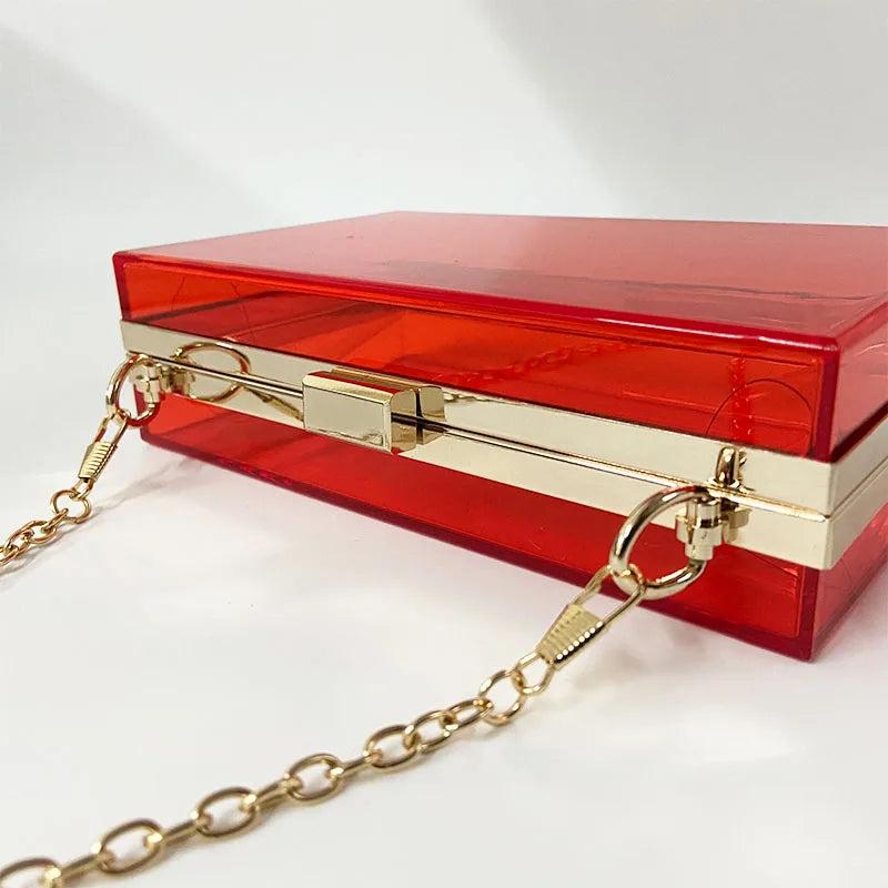 This stylish red transparent acrylic clutch bag is perfect for parties, evening events, weddings, and more. It features a chain strap and can be used as a shoulder bag or messenger bag.