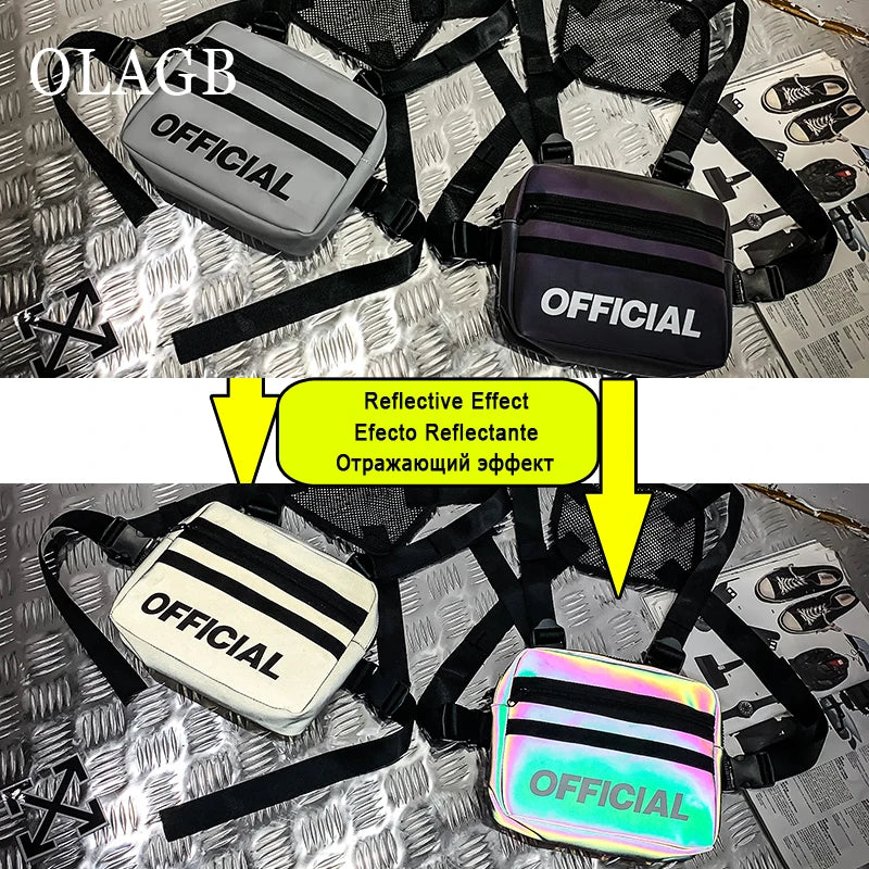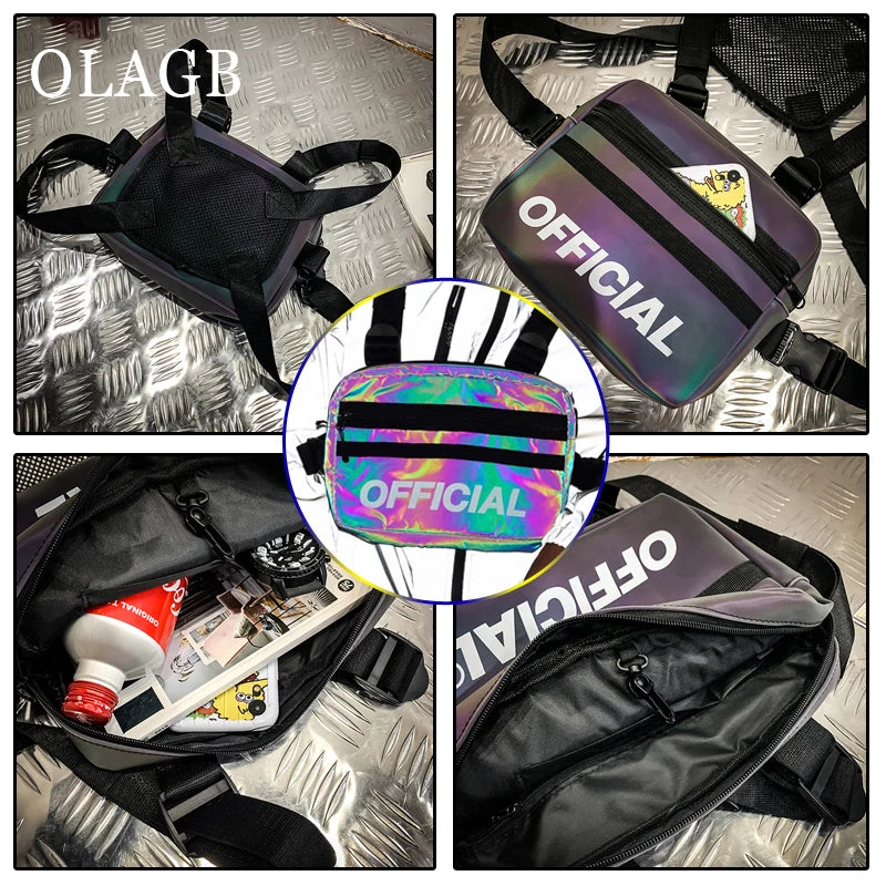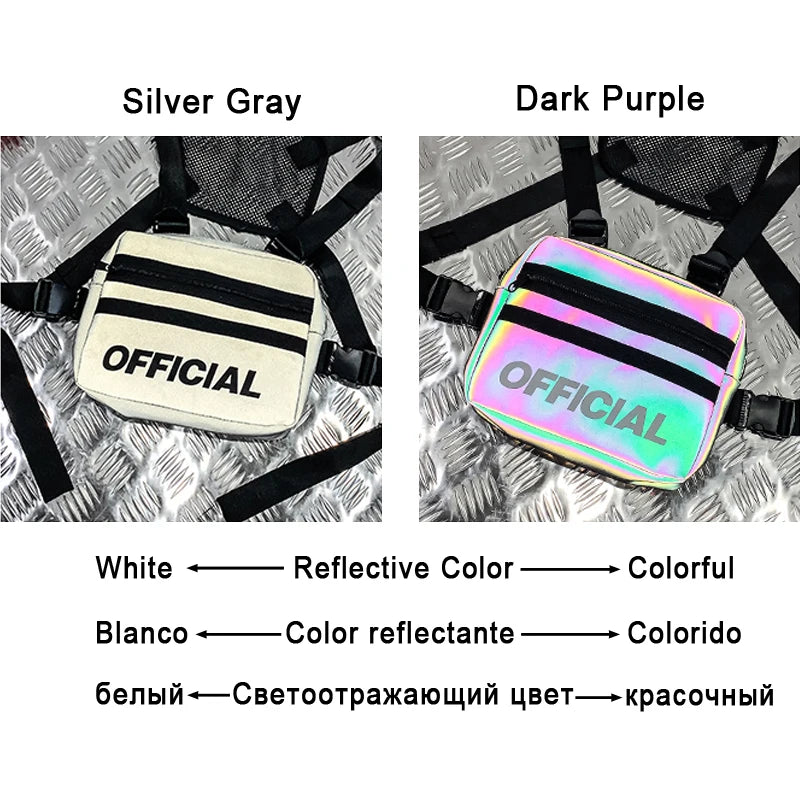 This reflective chest bag is perfect for parties or streetwear fashion. It features a light reflection design that adds a unique touch to your outfit.