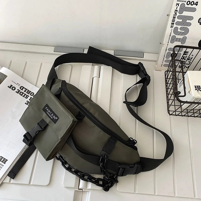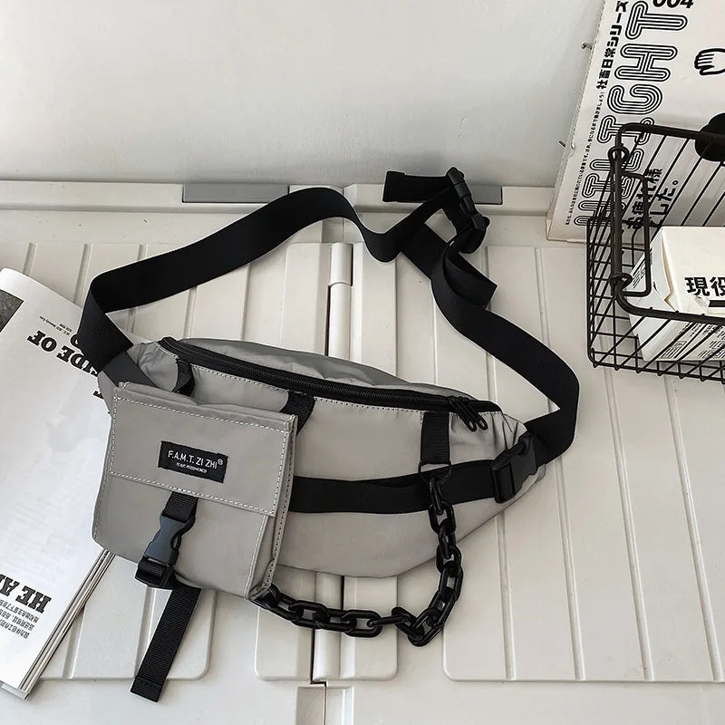 This techwear reflective crossbody bag offers a stylish and practical solution for carrying your essentials. Perfect for men and women in the hip hop and streetwear scene.