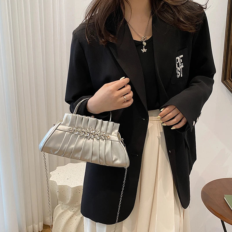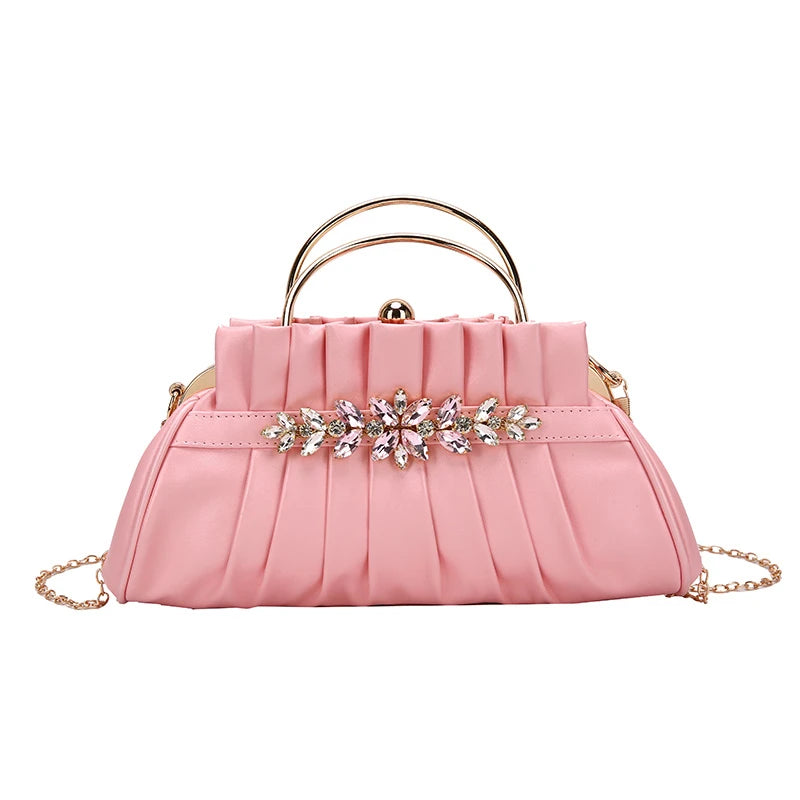 Elegant and stylish retro evening bag with ruched beading design. Features a clip buckle, metal chain, and is perfect for formal occasions.