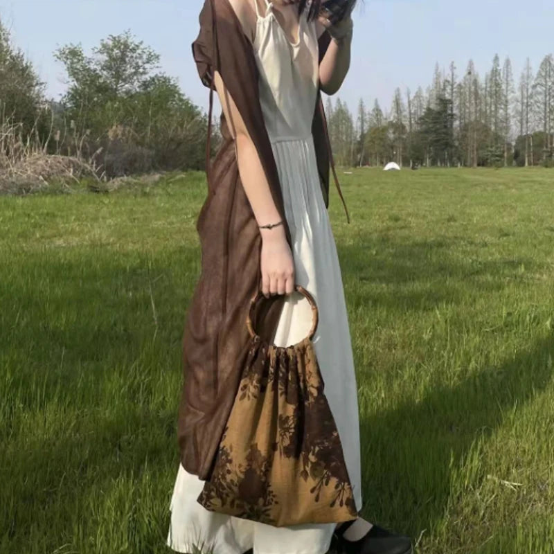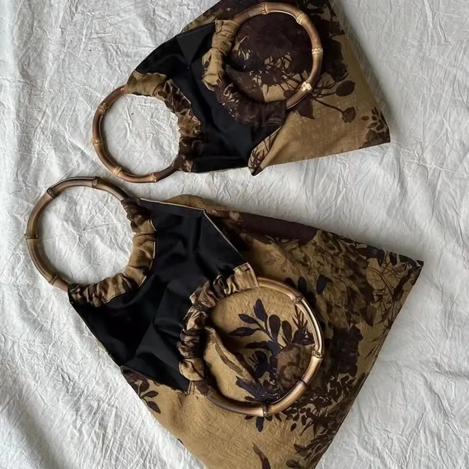 Retro Camellia Flower Printed Women's Bag Bamboo Portable Handbag