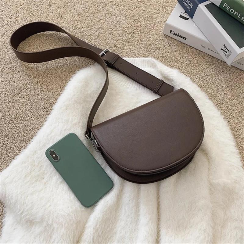 Elevate your style with this solid saddle bag that is designed in high-quality leather. This shoulder bag offers a retro look that is perfect for any occasion.