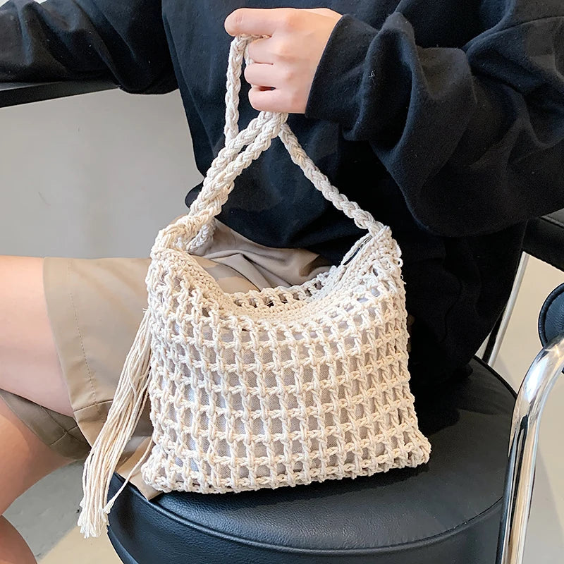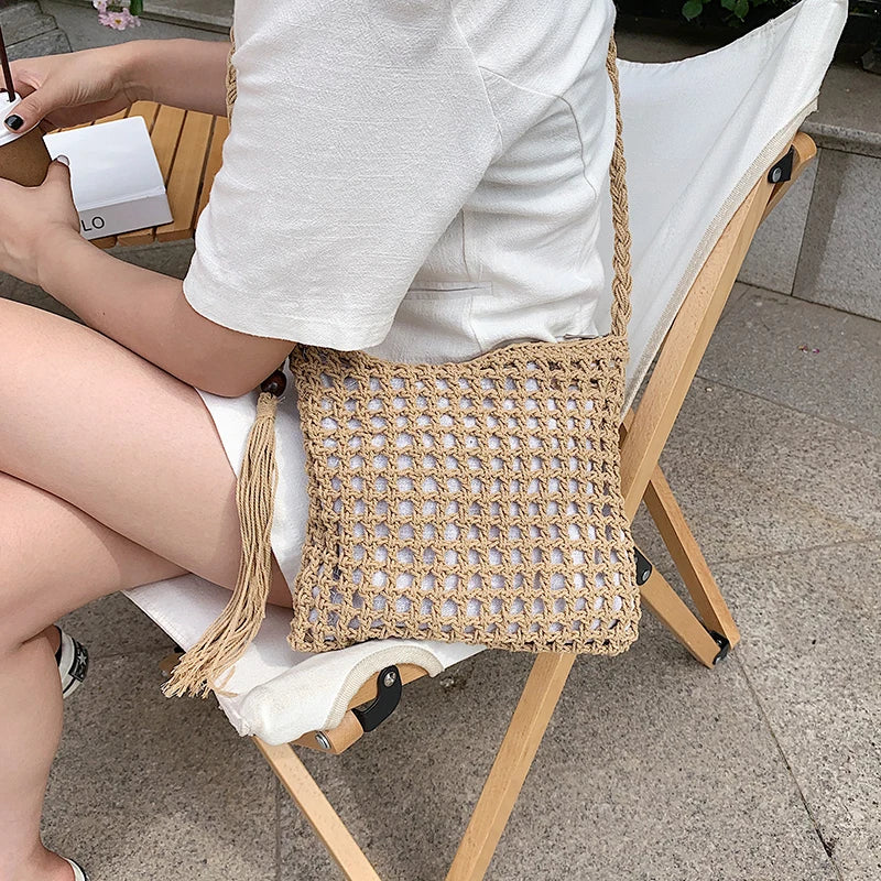Elevate your summer style with this retro hollow woven woolen crossbody bag. Perfect for the beach or casual outings. Features tassel details for a chic touch.