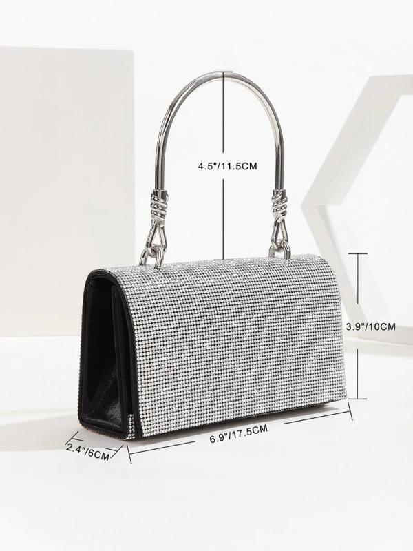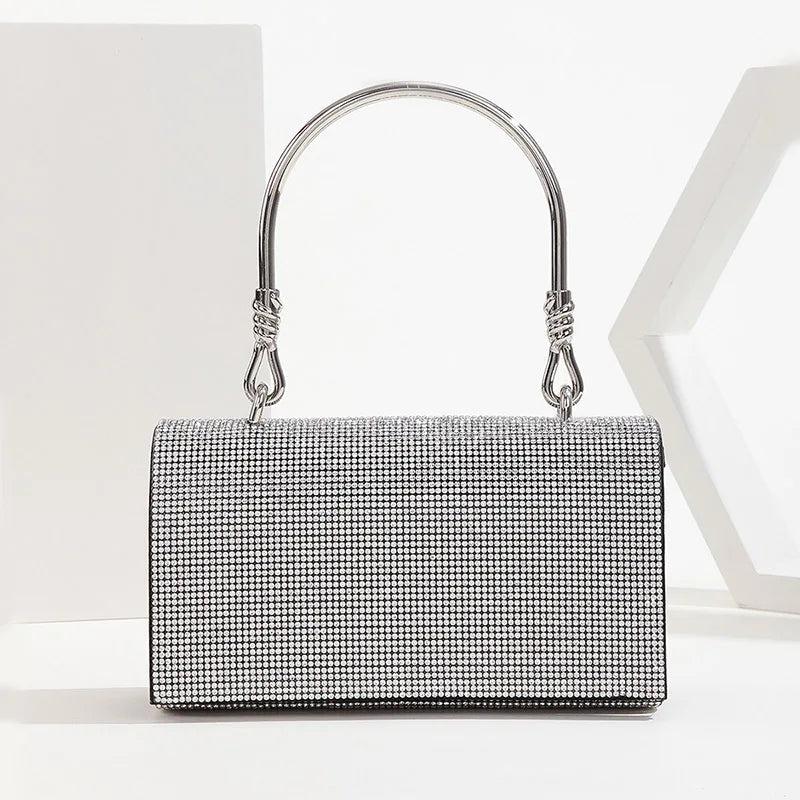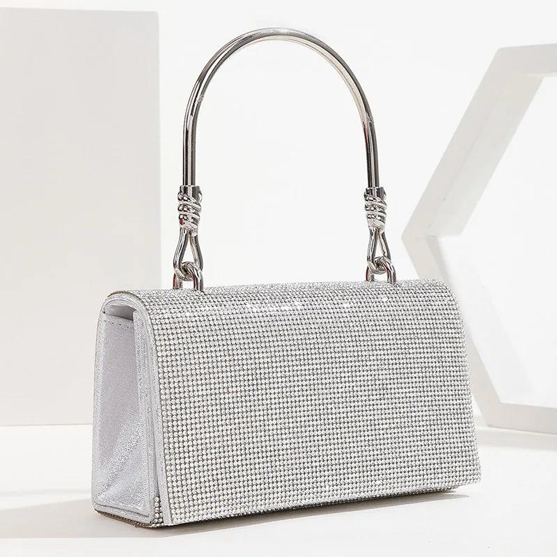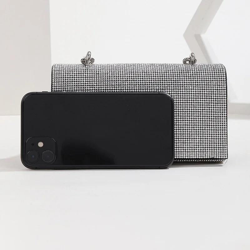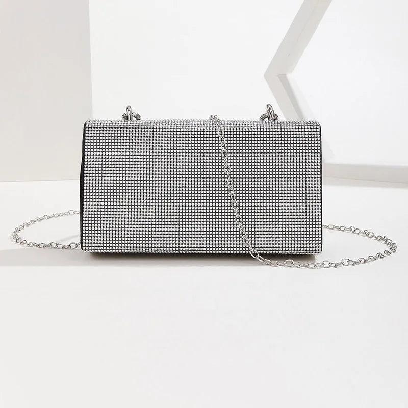 This stylish clutch evening bag is perfect for weddings, parties, and special occasions. It features rhinestone embellishments and a chain shoulder strap.