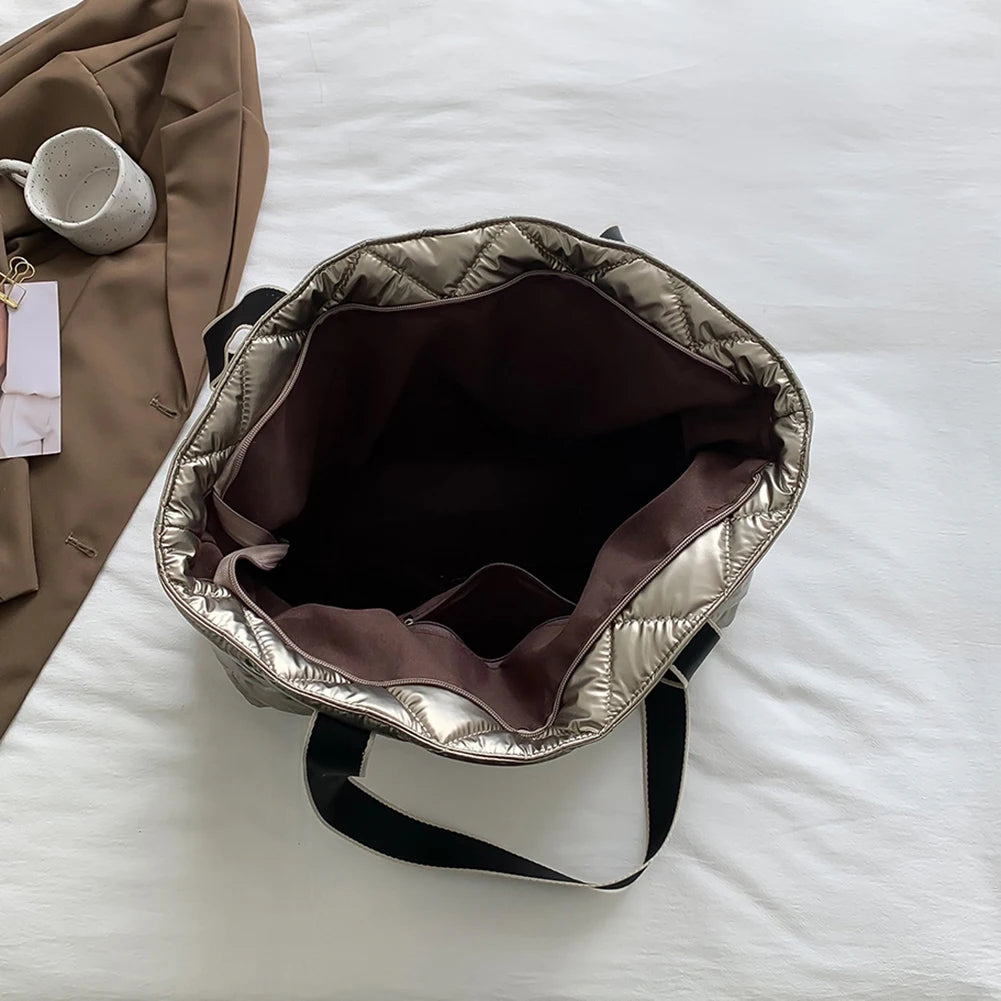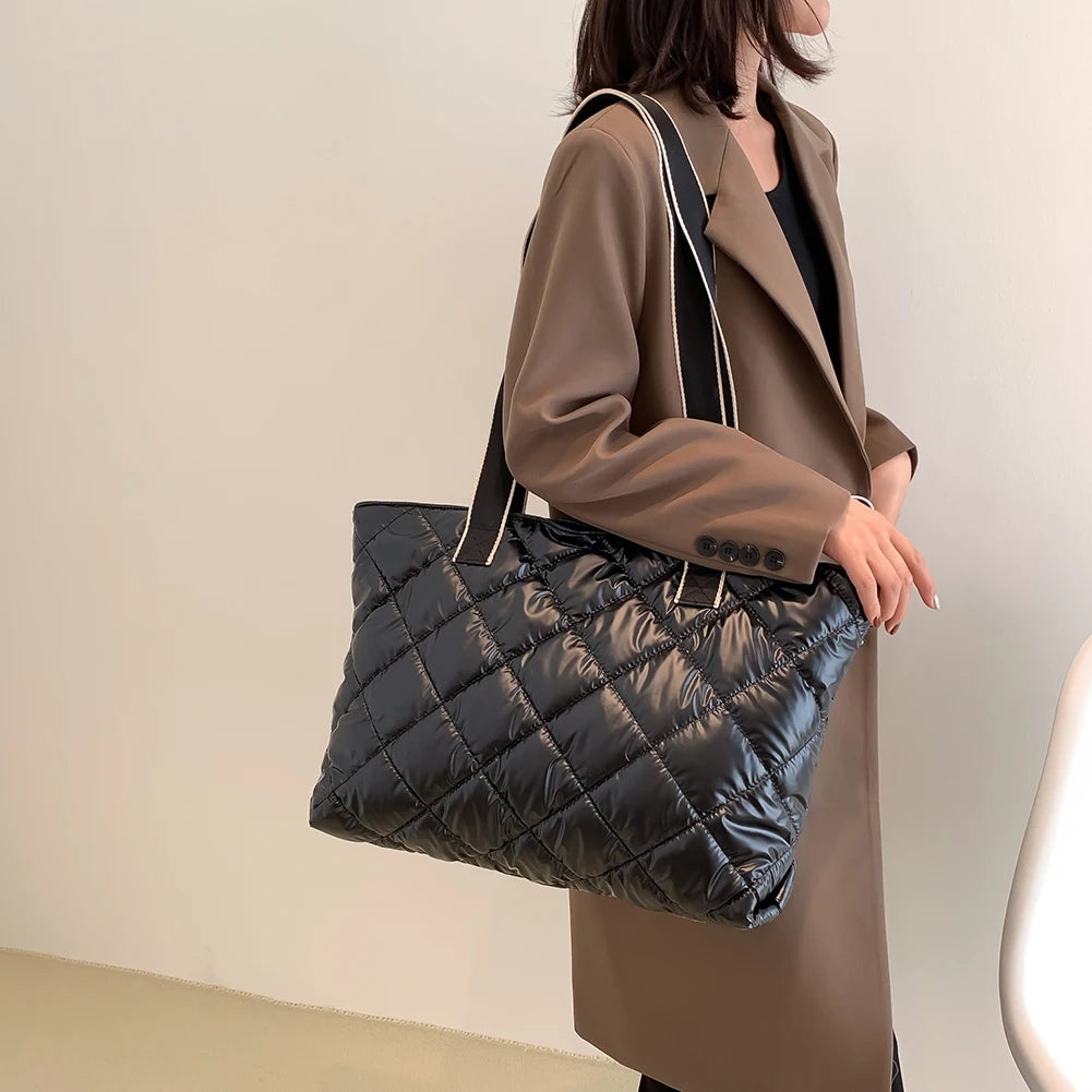 Stay stylish and cozy with this rhombic lattice cotton-padded bag, perfect for weekend getaways. Its large capacity and lightweight design are ideal for carrying all your essentials. The quilted material adds a touch of warmth and softness.