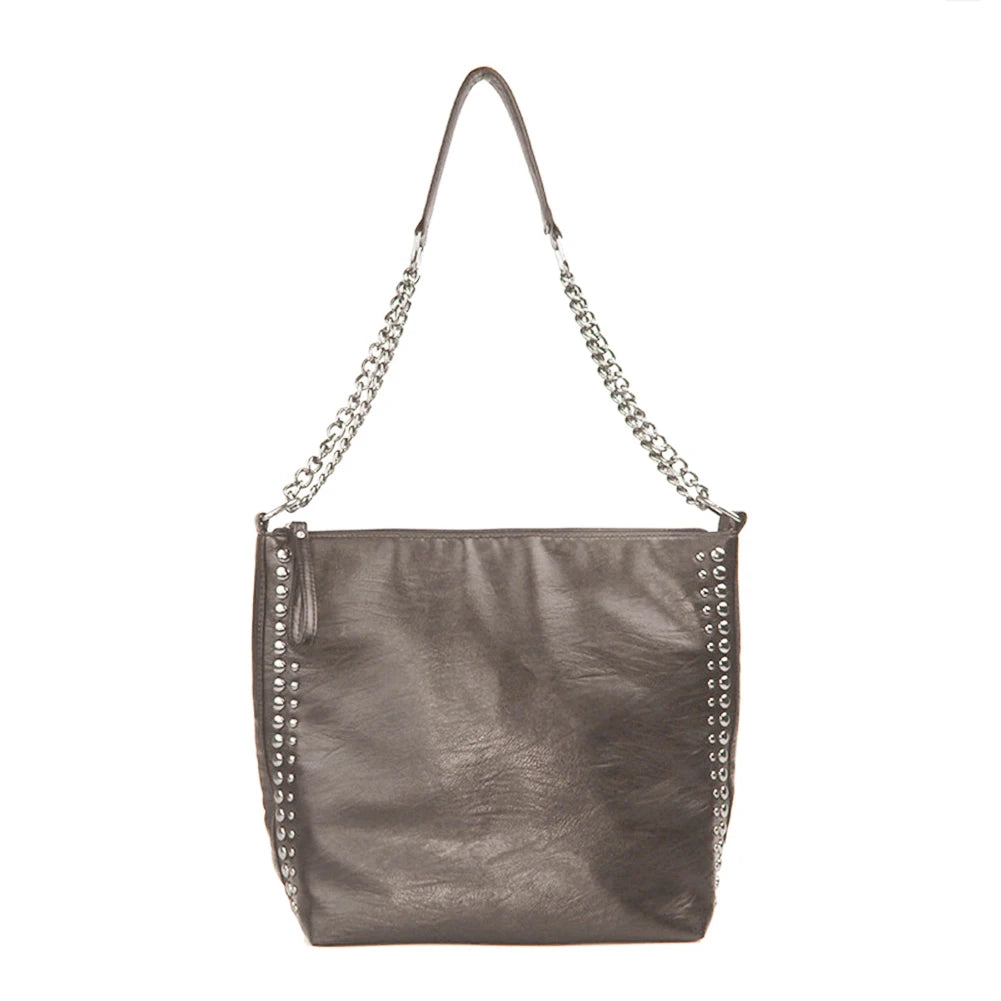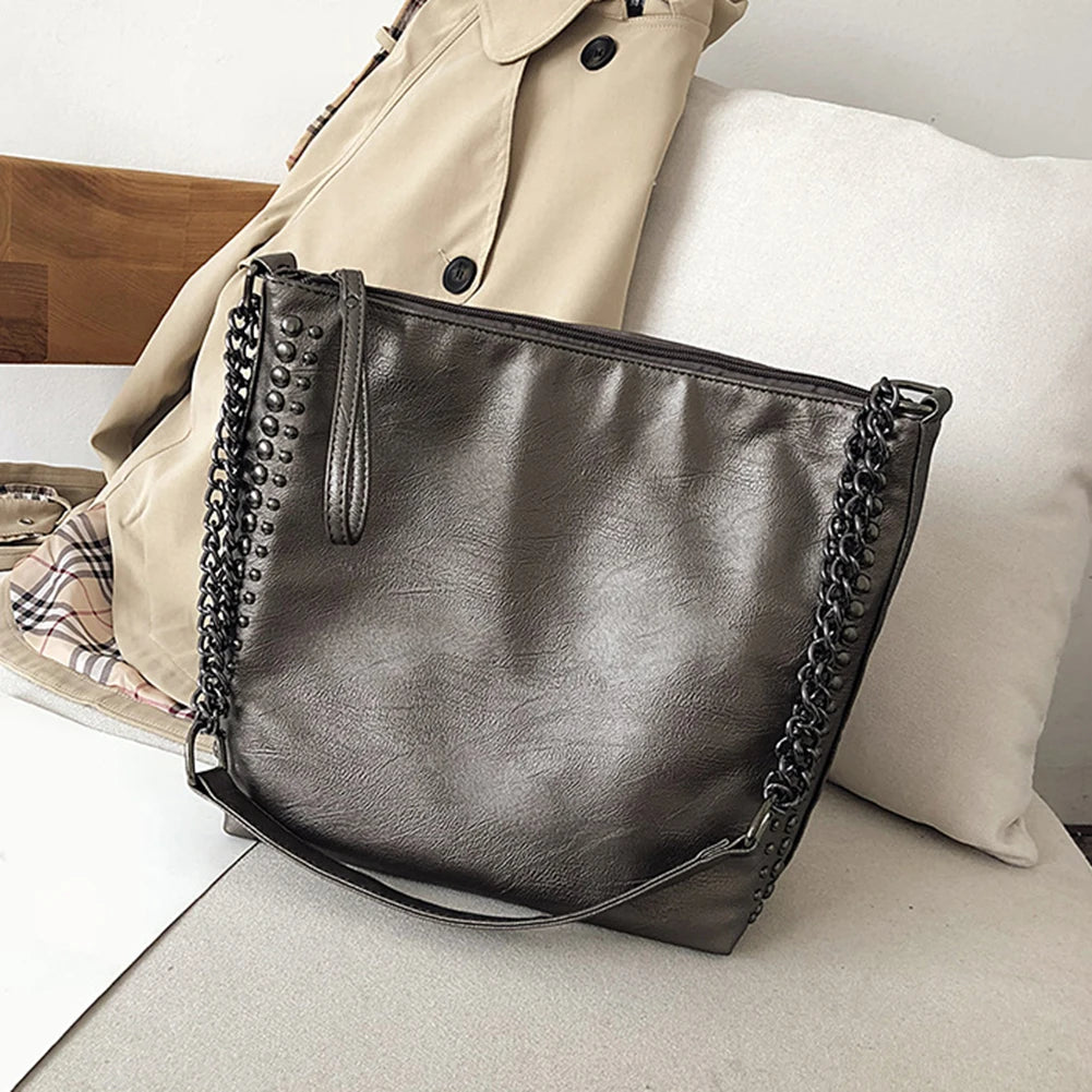 Casual yet stylish faux leather bag with rivet chain design. Ideal for everyday use or a night out.