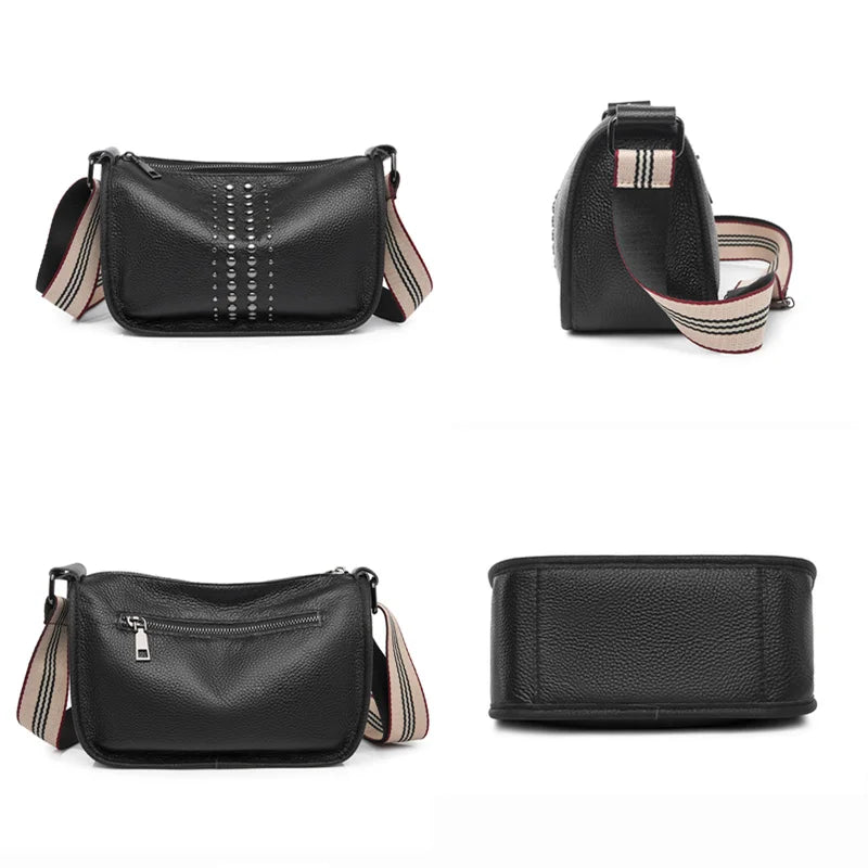 This stylish crossbody bag features rivet embellishments and a wide shoulder strap. Made of high-quality leather, it is perfect for everyday use.