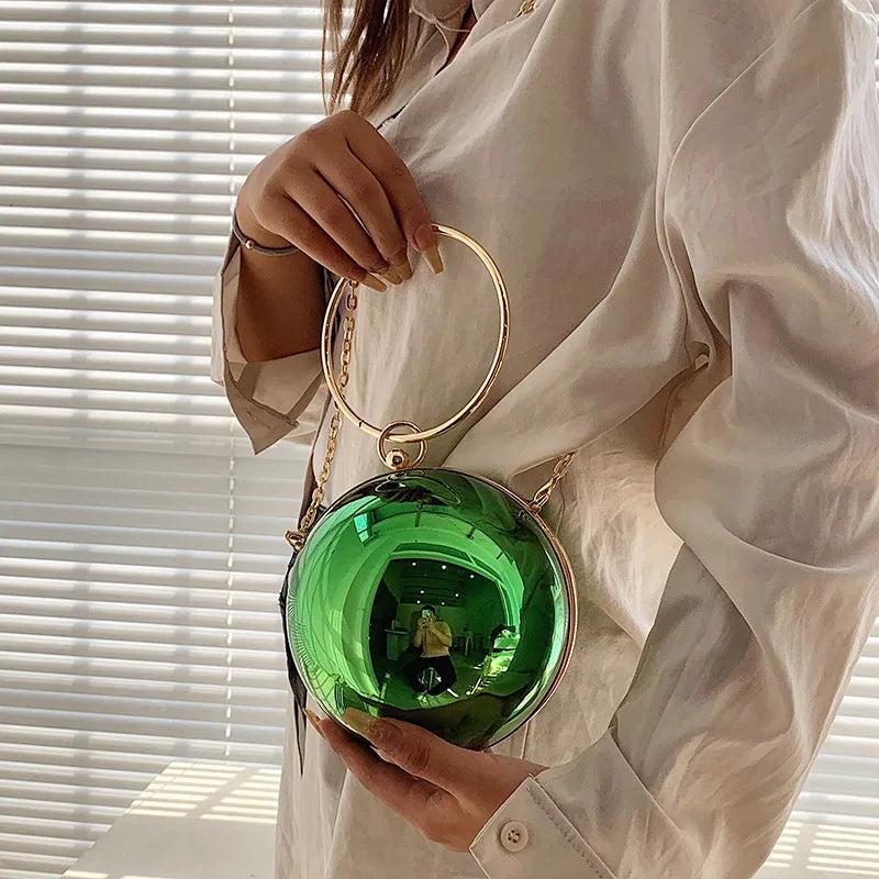 Elegant round ball evening bags with smooth and bright surface, perfect for special occasions.