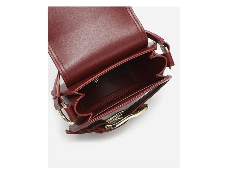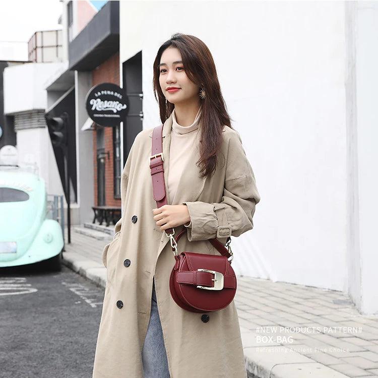 This small round saddle bag features a broad PU leather strap for a stylish look. Perfect for women who like a compact yet fashionable crossbody bag.