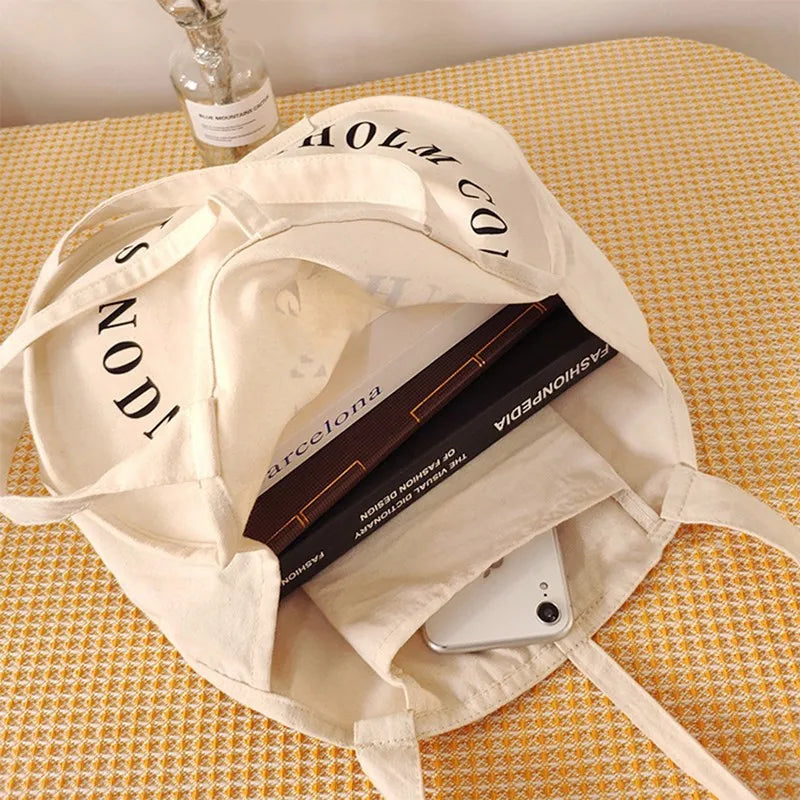 This casual female tote bag features a round shape with canvas material and letter decoration. It is perfect for everyday use.