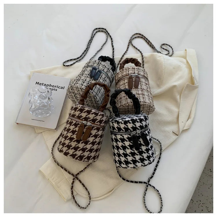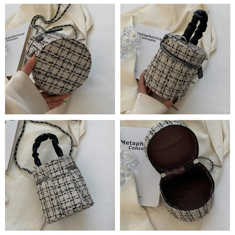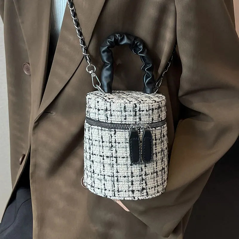 Ruched Leather Handle Bag Tweed Bucket Crossbody Wool Chunky Handbags