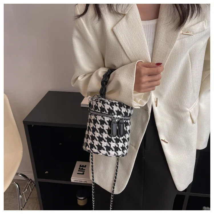Description:Elevate your style with this chic tweed bucket bag featuring ruched leather handle. Made from high-quality wool, this crossbody bag is perfect for any occasion.Features: Chic tweed bucket bag with ruched leather handle Crafted from high-quality wool for durability Great for everyday use or special occasions Adjustable chain strap for...