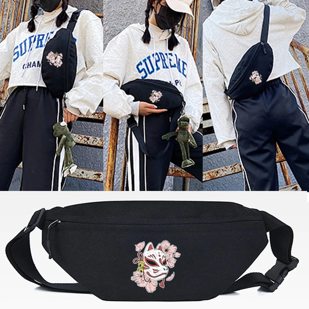 This stylish waist bag is perfect for both men and women. It features a cute Sakura fox print and is made of durable canvas material. The bag is suitable for casual outings, travel, and everyday use.