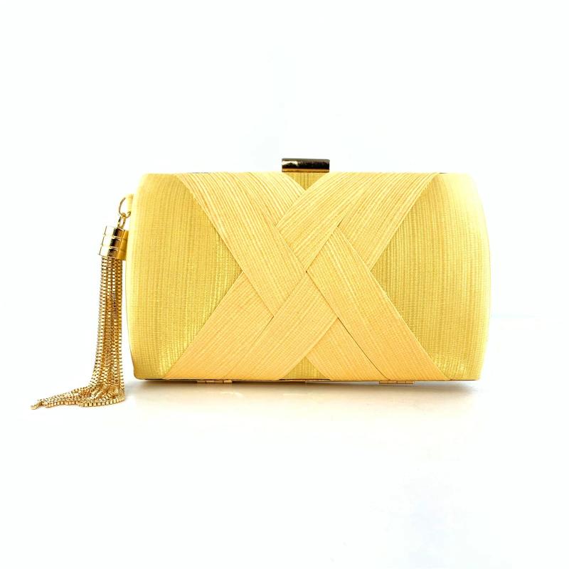 Elegant satin clutch bag with criss-cross design, perfect for evening parties. Features a tassel and golden metal shoulder chain for a glamorous look.