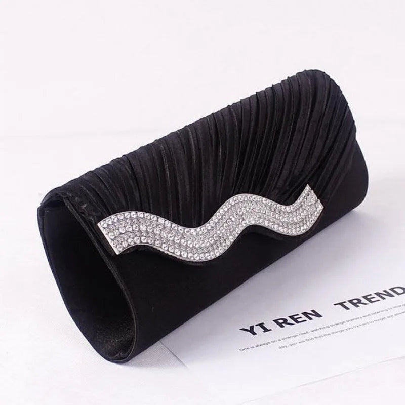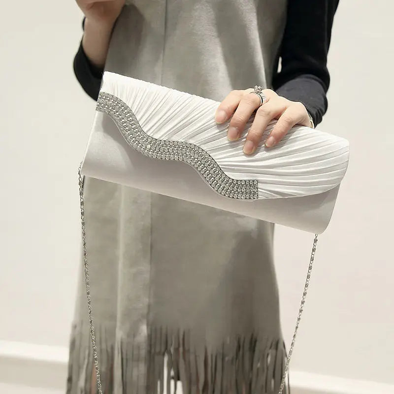This elegant satin clutch is perfect for weddings or evening parties. It features a rhinestone embellishment and comes with a detachable chain strap for versatile carrying options.