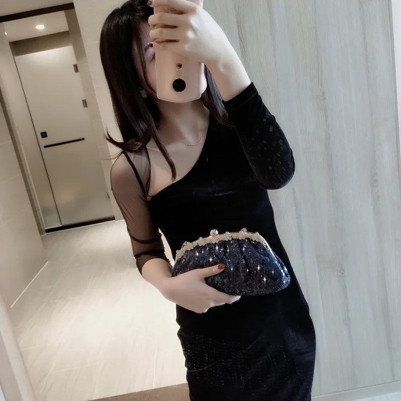 This elegant dark clutch bag features bling sequins and diamonds, perfect for parties and evening events. It includes a wallet chain and shoulder strap for versatility.