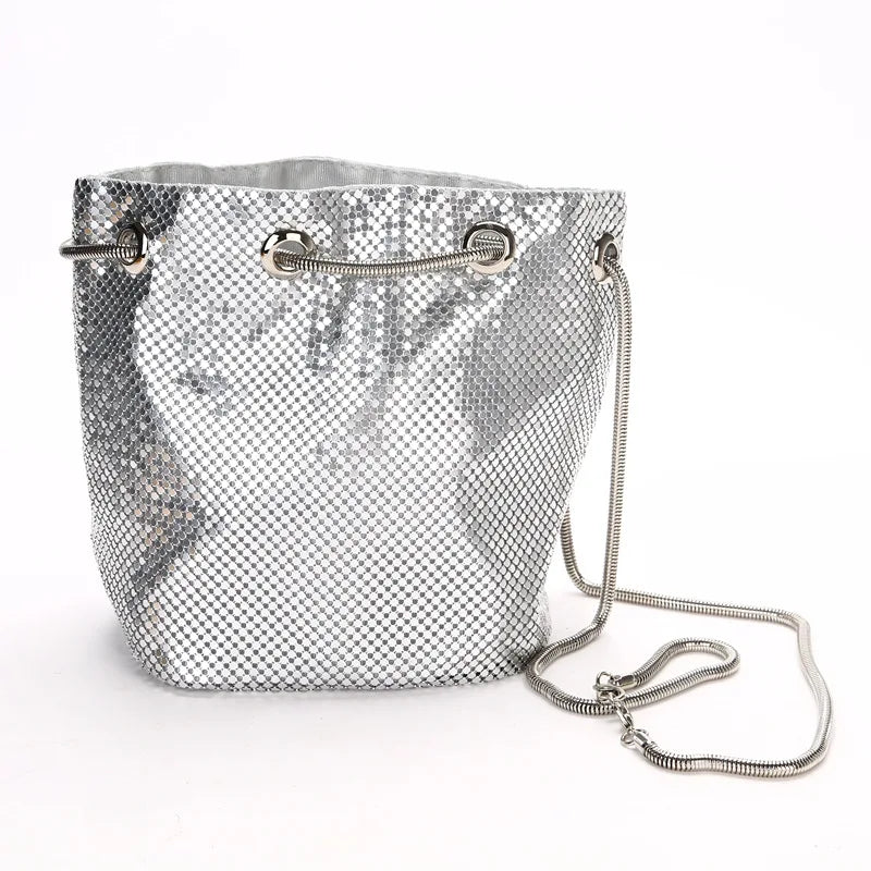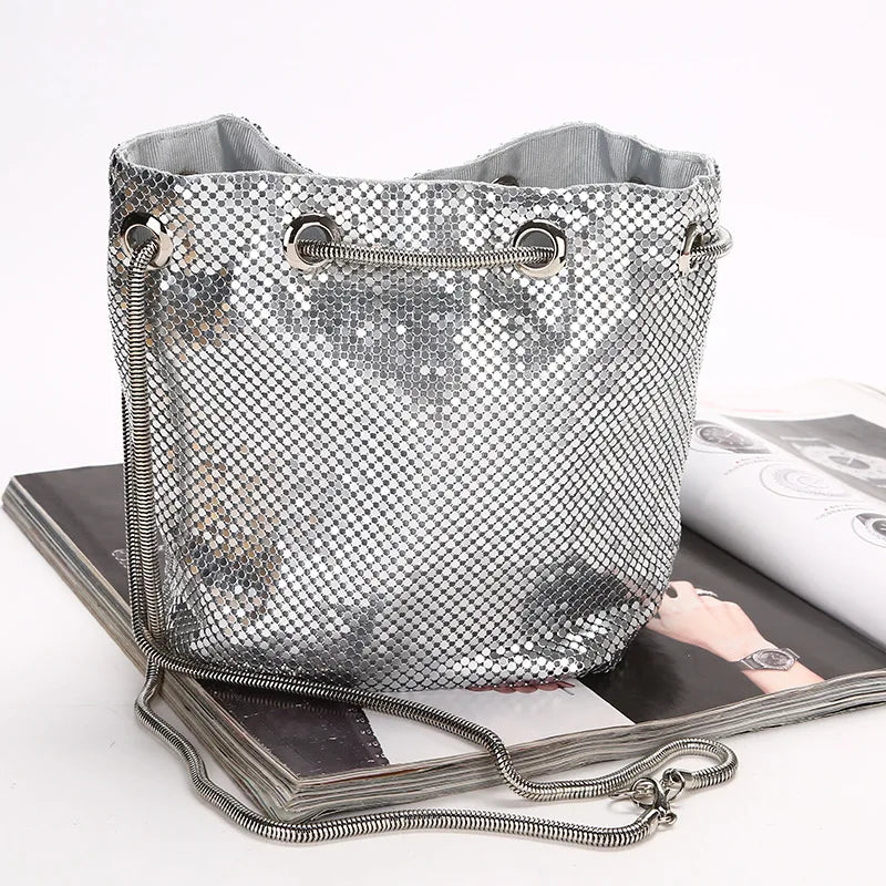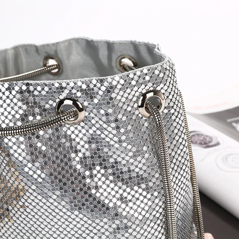 This women's bucket shoulder bag is perfect for evening parties, with a stylish sequin design. It can also be used as a crossbody bag. The sliver purse is ideal for girls and features a feminine clutch style. Bolsos for the modern woman.